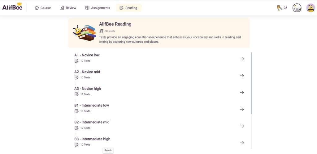Alifbee is implemented as a flexible learning solution accessible through mobile applications available on both App Store and Google Play. The platform accommodates learners at all proficiency levels, from complete beginners to advanced students. Educational institutions can utilize Alifbee's comprehensive curriculum that follows a clear progression path, allowing students to advance at their own pace while receiving consistent feedback. The platform's design encourages regular practice through its bite-sized lesson format, making it easy to integrate into classroom activities or assign as supplementary practice. Teachers can monitor student progress through the self-assessment tests, while the cultural components provide valuable context for deeper understanding of the Arabic language.